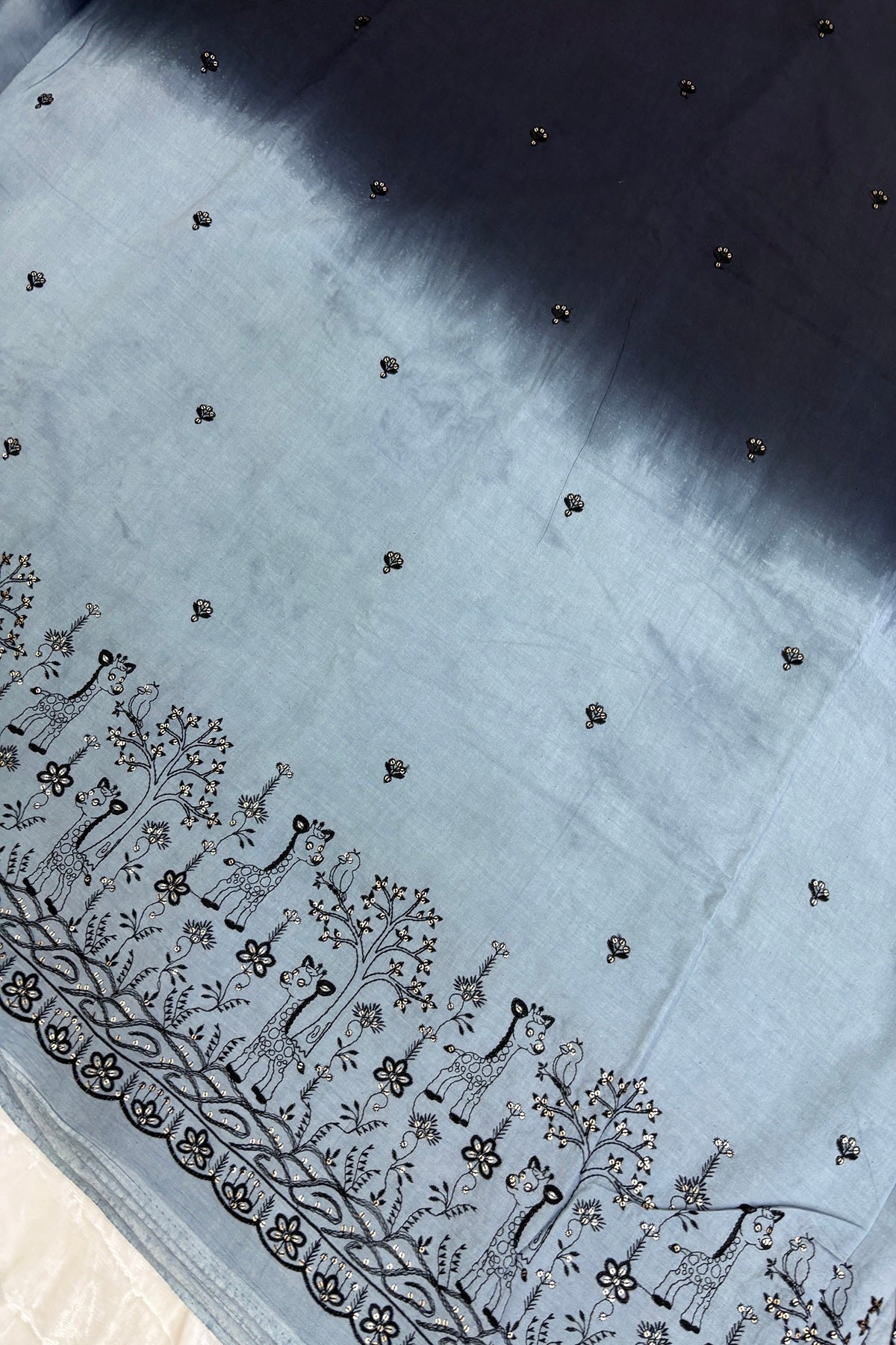 Black & Grey Jungle Theme Embroiderey With Scallop Border Highligted With Sequins Kora Cotton Fabric