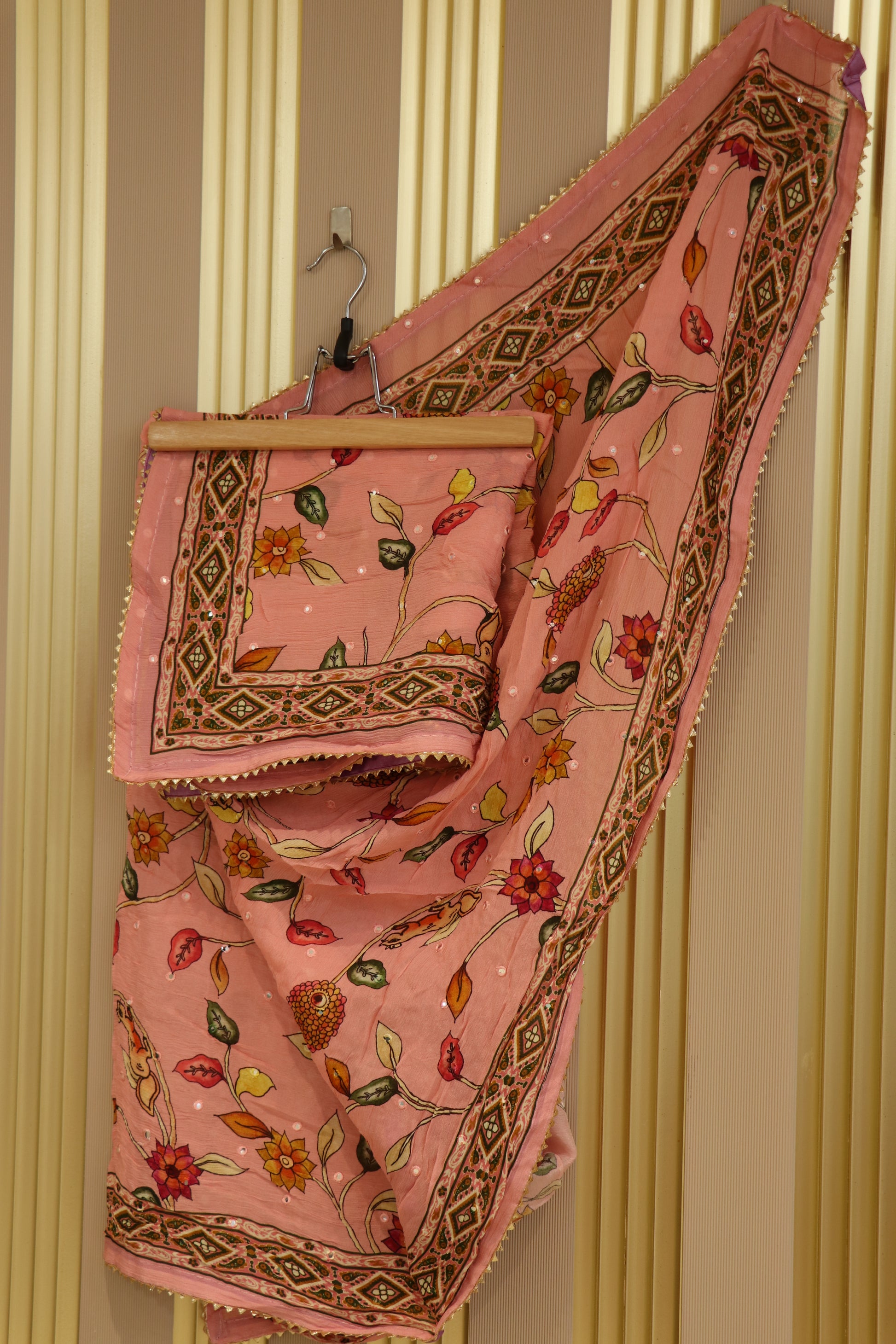 Chinnon printed dupatta highlighted with mirror work and gota lace edges perfect to pair up with ethnic lehengas,salwar suits,kurtas and more.
