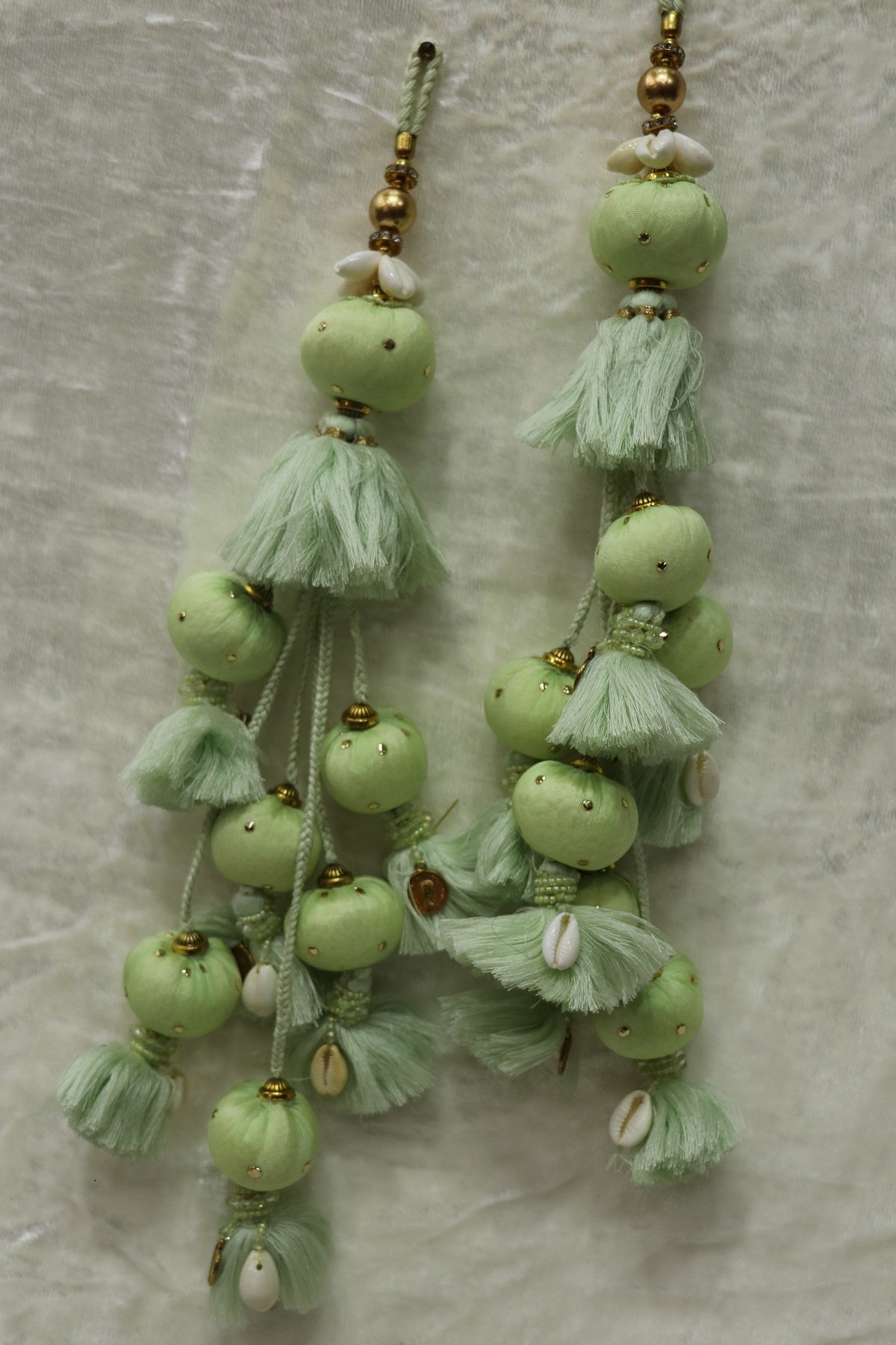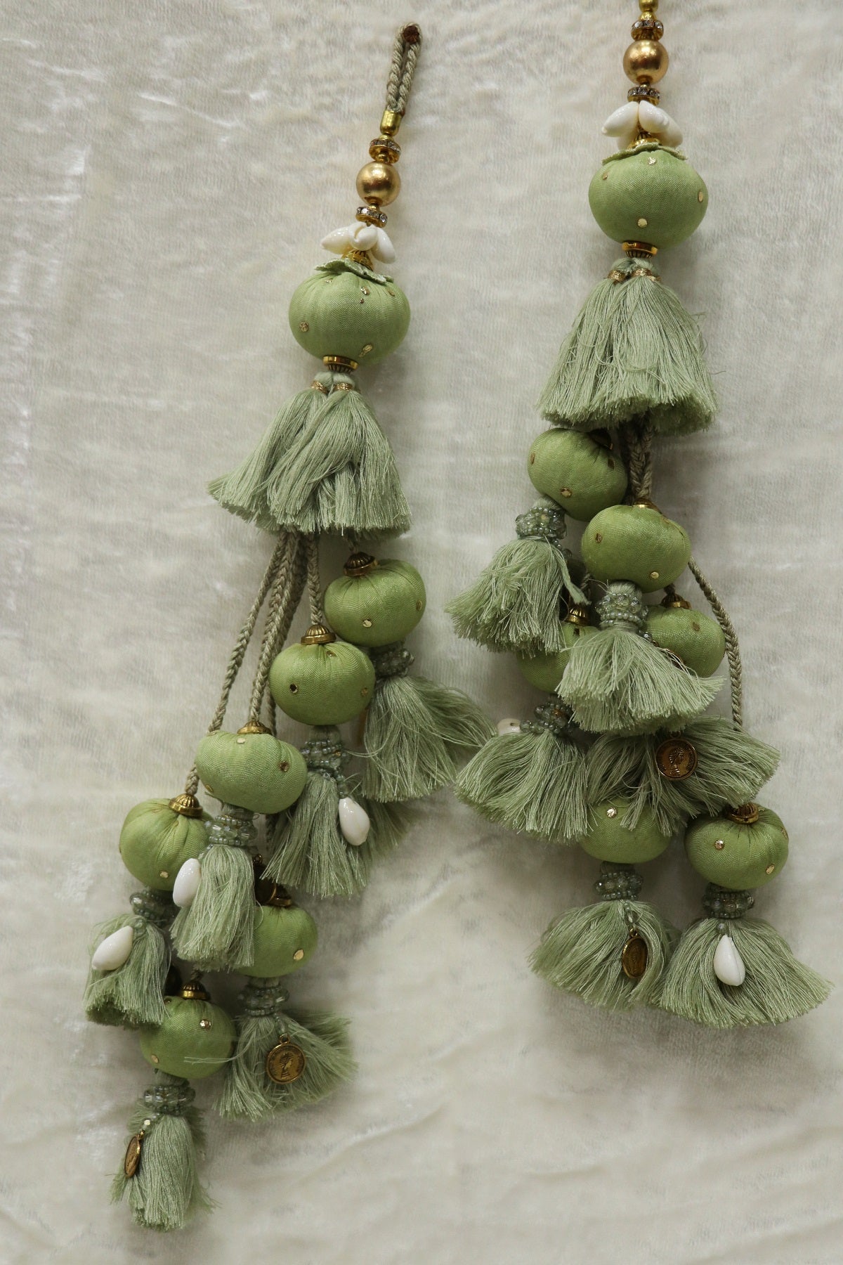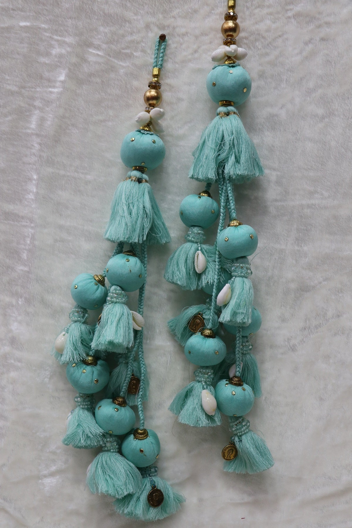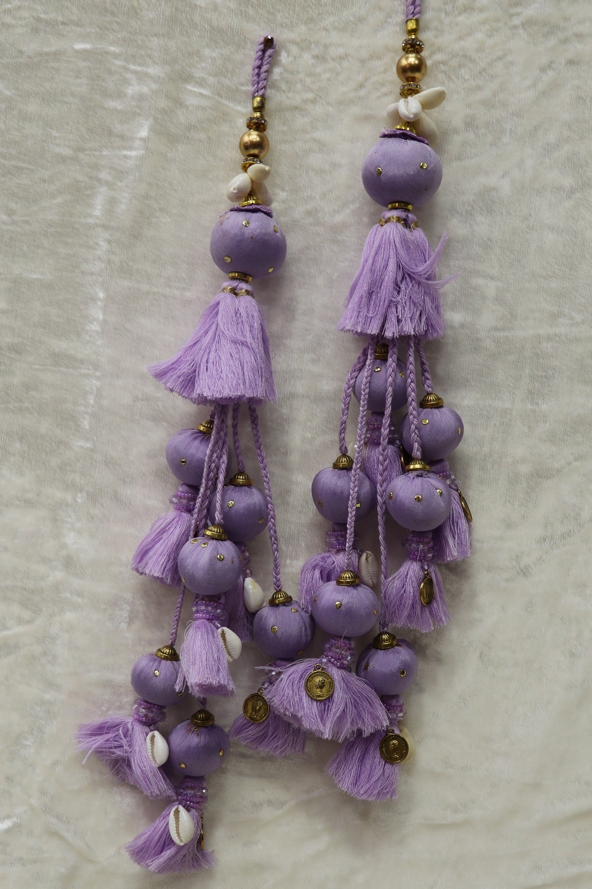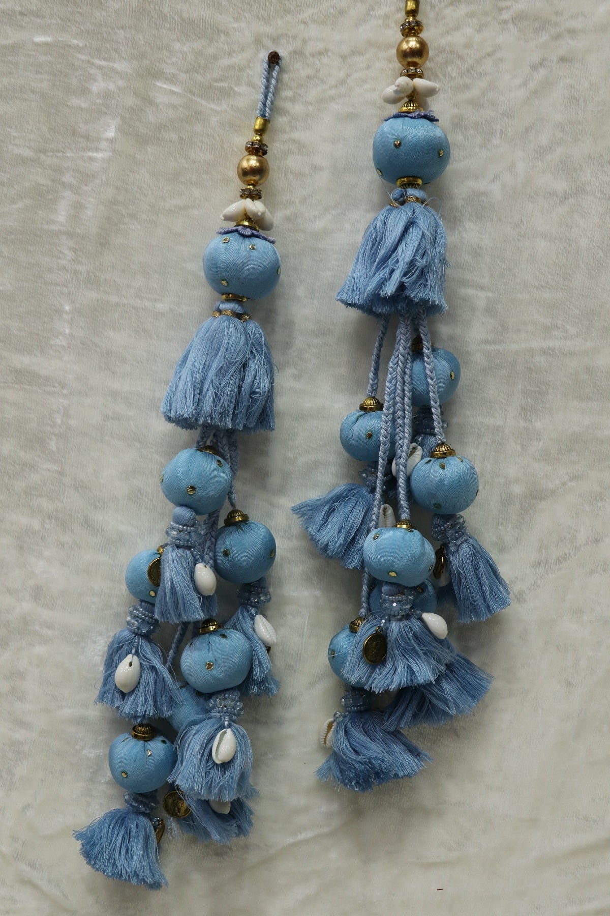 Lehenga latkans are exquisite decorative tassels adorned with threadwork, beads, crystals, cut beads, and pearls, adding a charming and elegant finishing touch to traditional bridal and festive lehengas, enhancing their beauty with intricate craftsmanship and vibrant details.