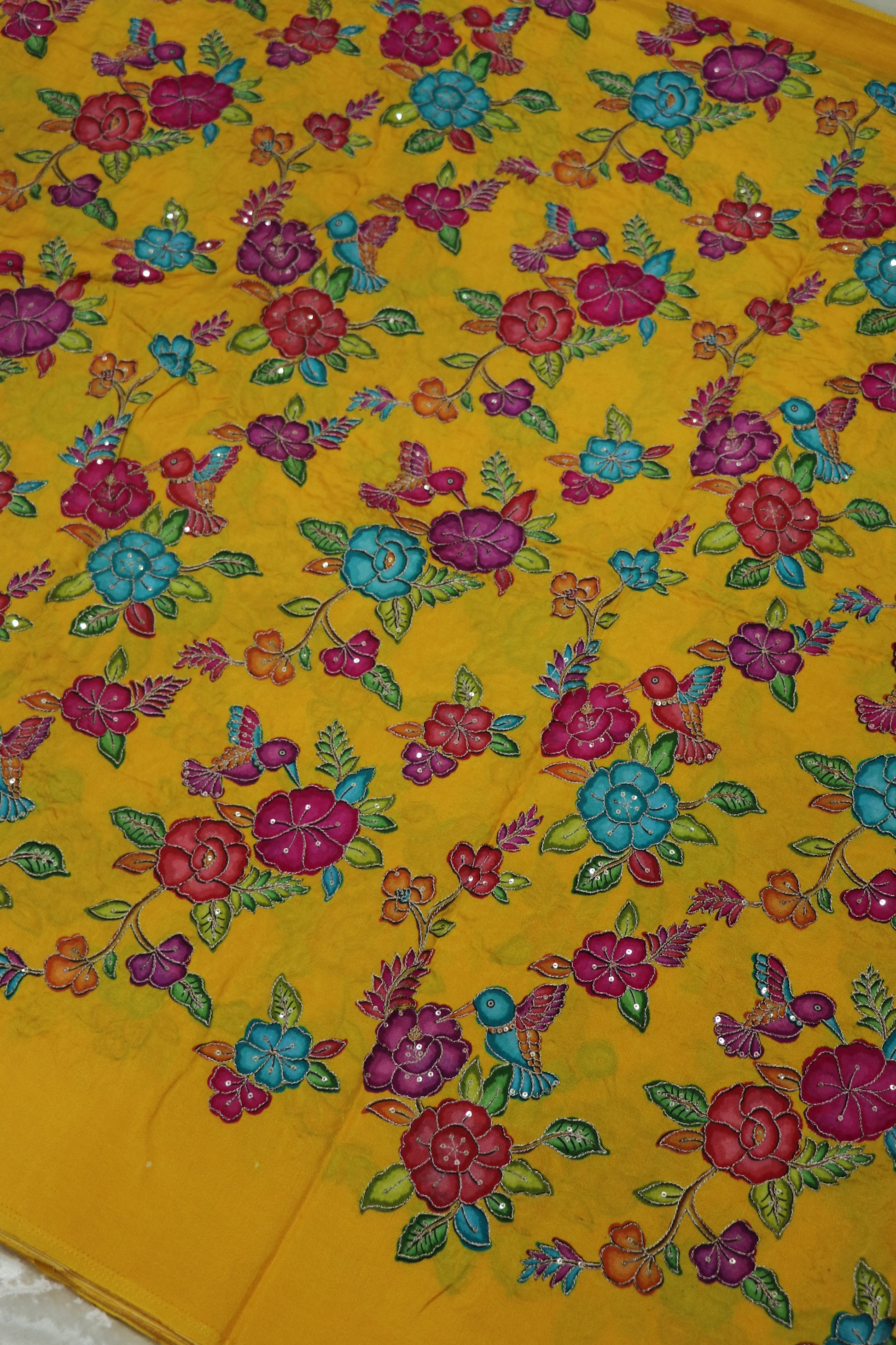 Dola Silk Floral Printed Fabric With Kingfisher Birds Highlited With Zari Threads & Sequins