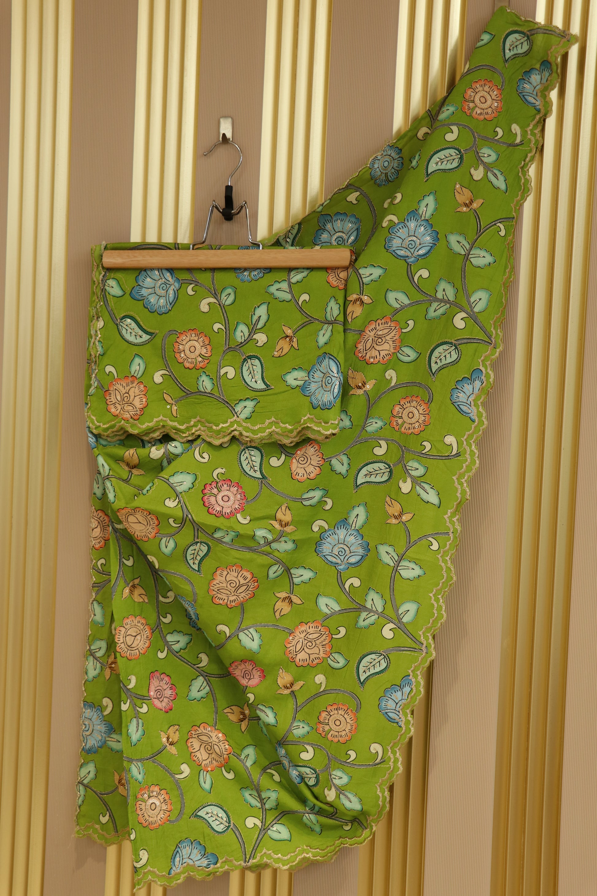 Dola silk digitally printed kalamkari highlighted with zari thread,sequins and scalloped zari embroidery,perfect for pairing with kurtas,salwar suits,lehengas and more.