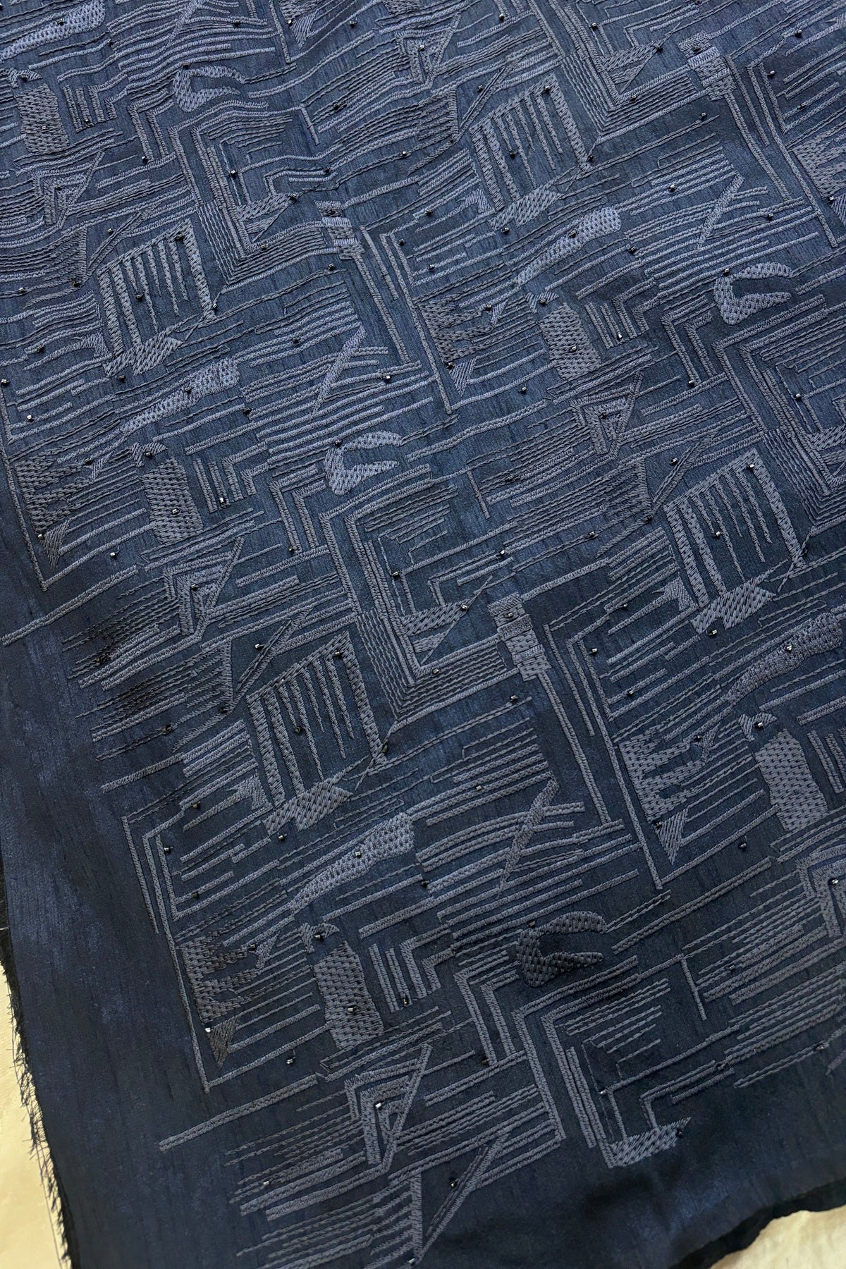 Elevate your wardrobe with semi raw silk embroidered in striking geometric patterns using shimmering cut-beads. This textured, lightweight fabric offers a subtle sheen and natural drape, blending rustic charm with modern opulence.