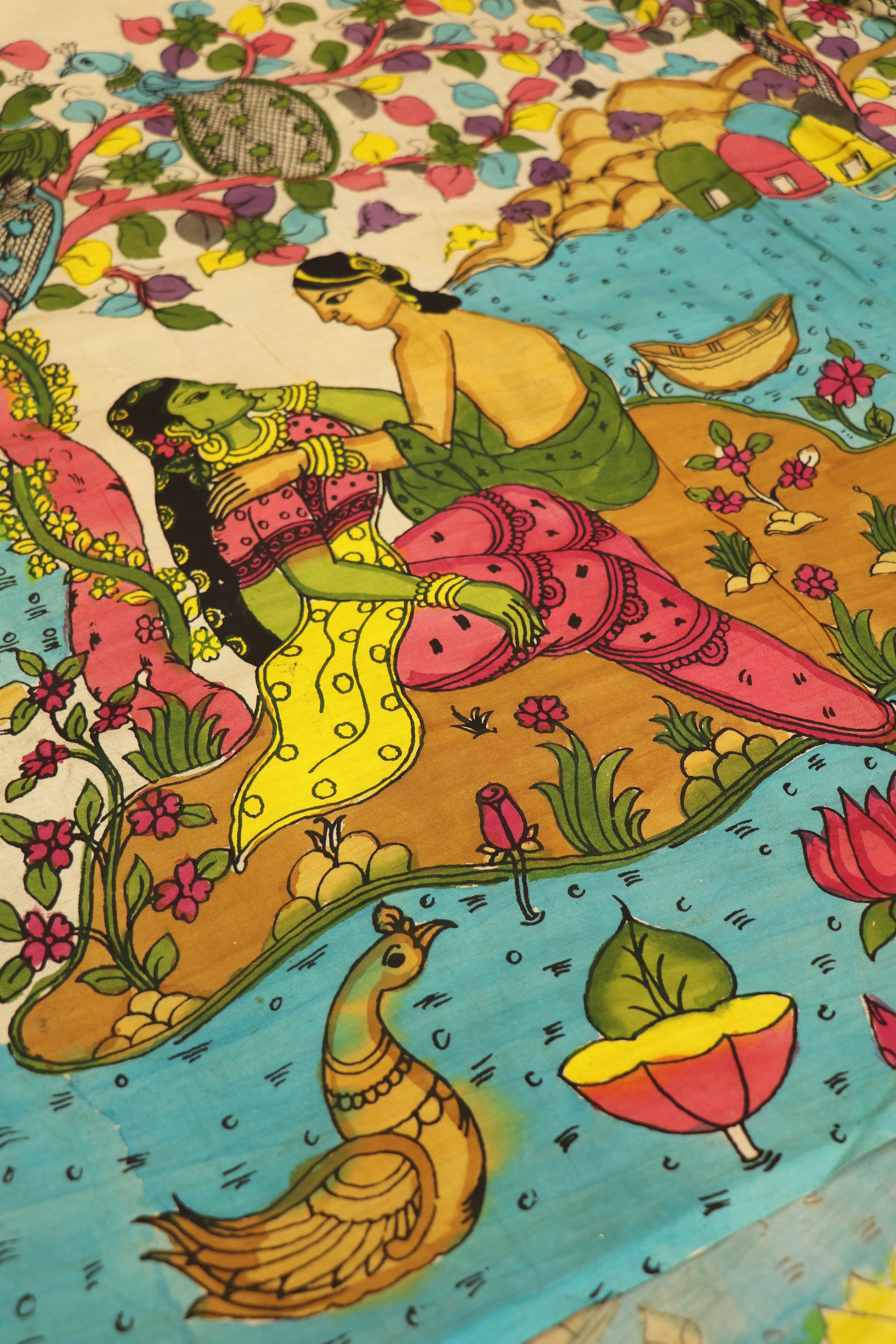 Pure pen kalamkari lehenga silk fabric showcases vibrant,hand painted designs and rich story telling through art which is perfect for marriage,s etc.Pair it up with blouse making up attires like long frocks,lehenga croptops,long blouses,indo western outfit and more.