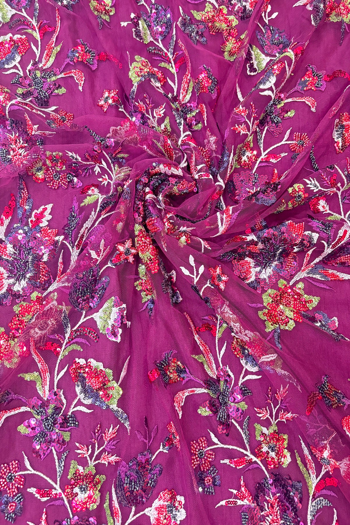 Midnight Violet Floral Bunches Embroidered With Multi Thread & Multi Sequins Net Fabric