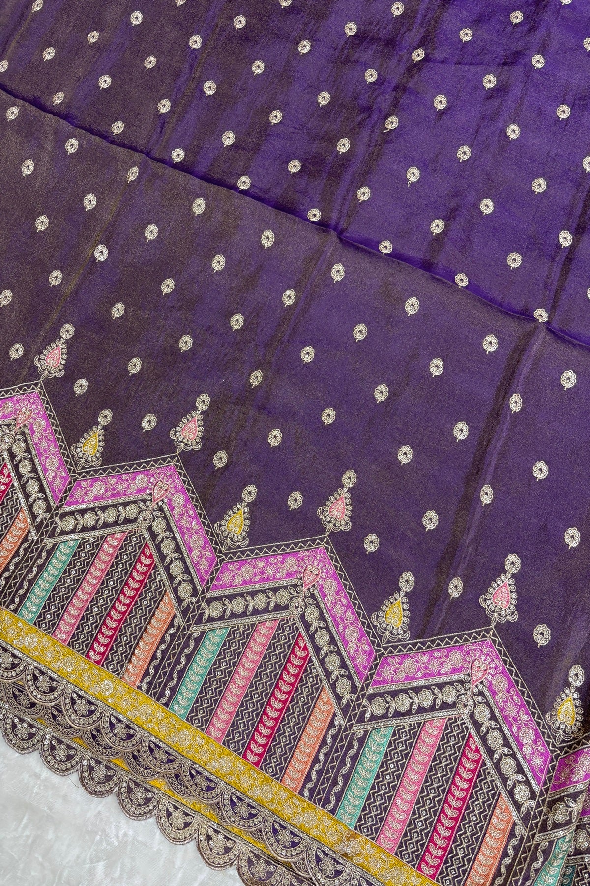 Multi Thread Embroidered Temple Shaped Border With Scallop Edges Uppada Tissue Lehenga Fabric