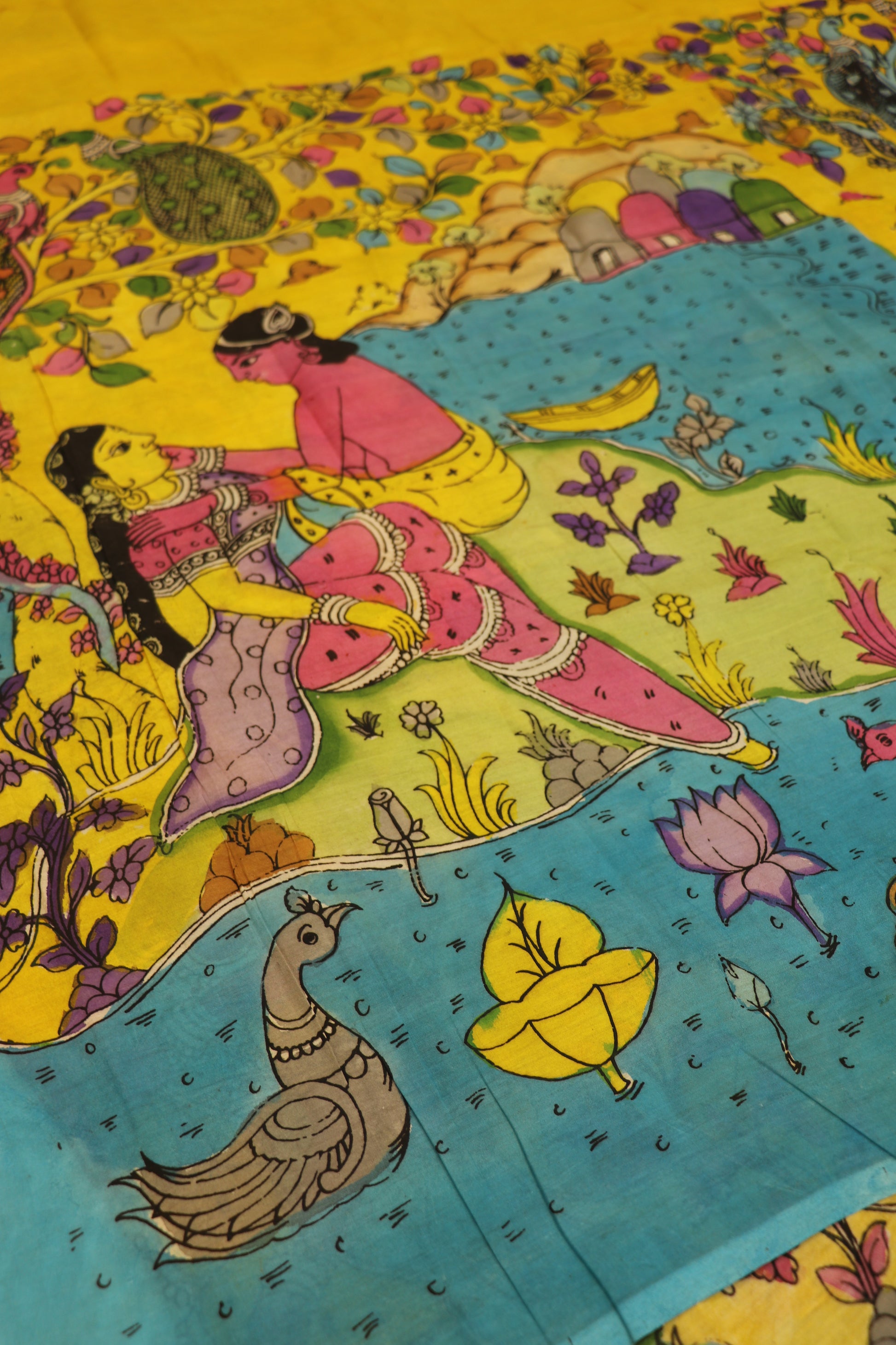 Mustard Yellow Pure Pen Kalamkari Hand Painted Lehenga Silk Fabric (Minimum Order 5 meter)