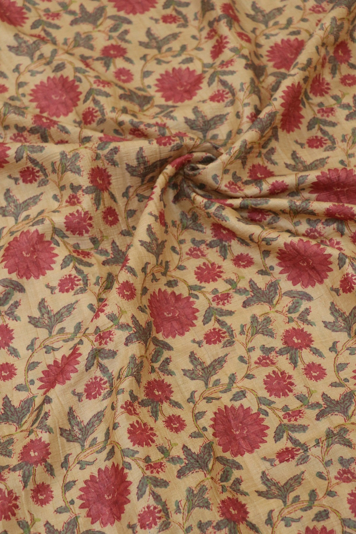 Natural Desi Tussar Latte Brown Base Red Floral Printed Fabric