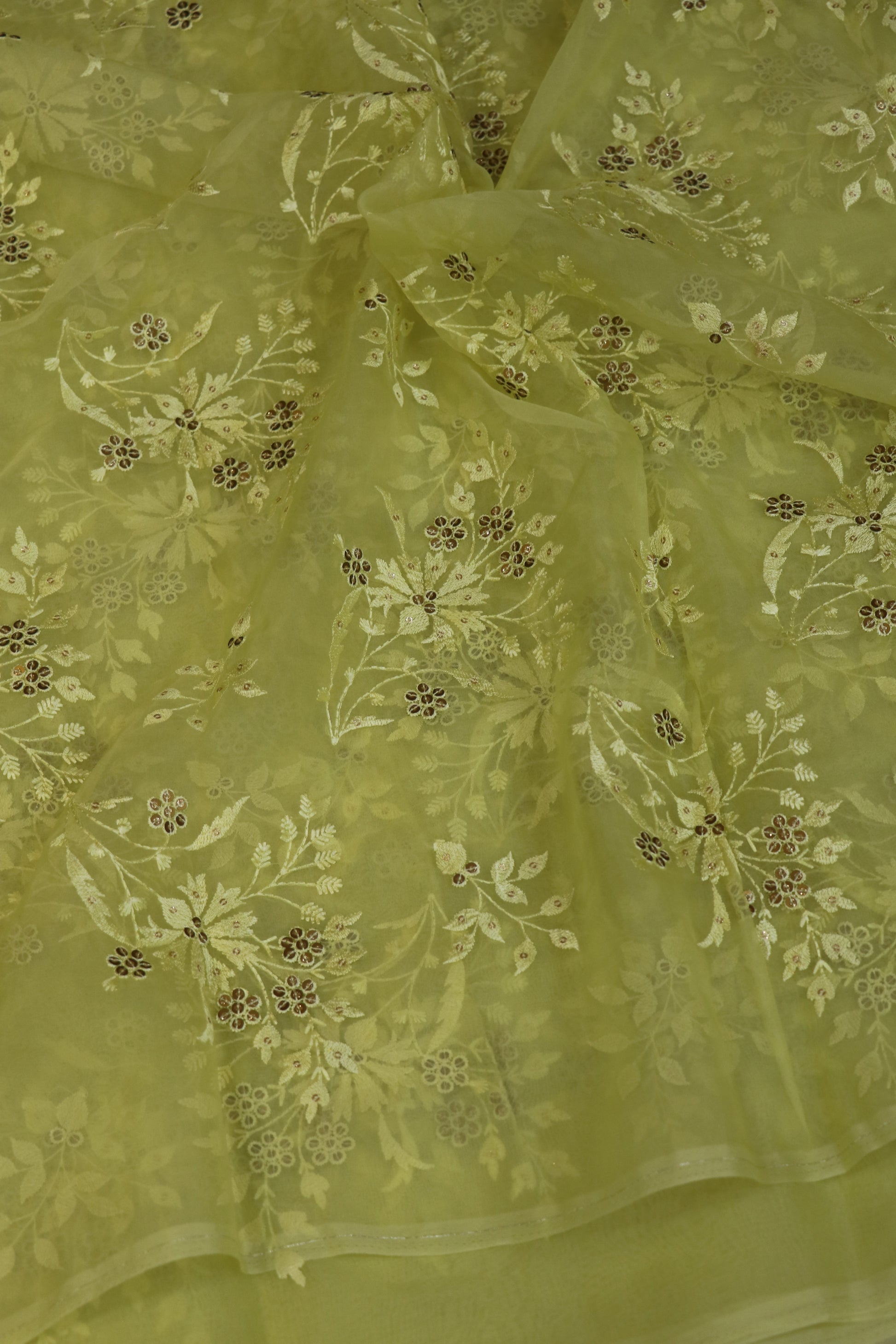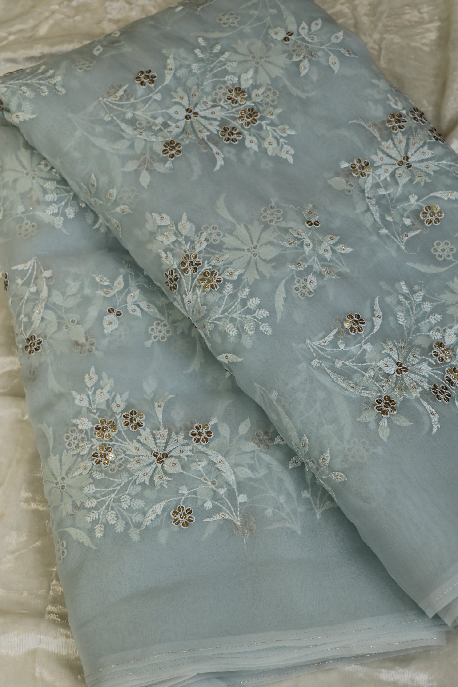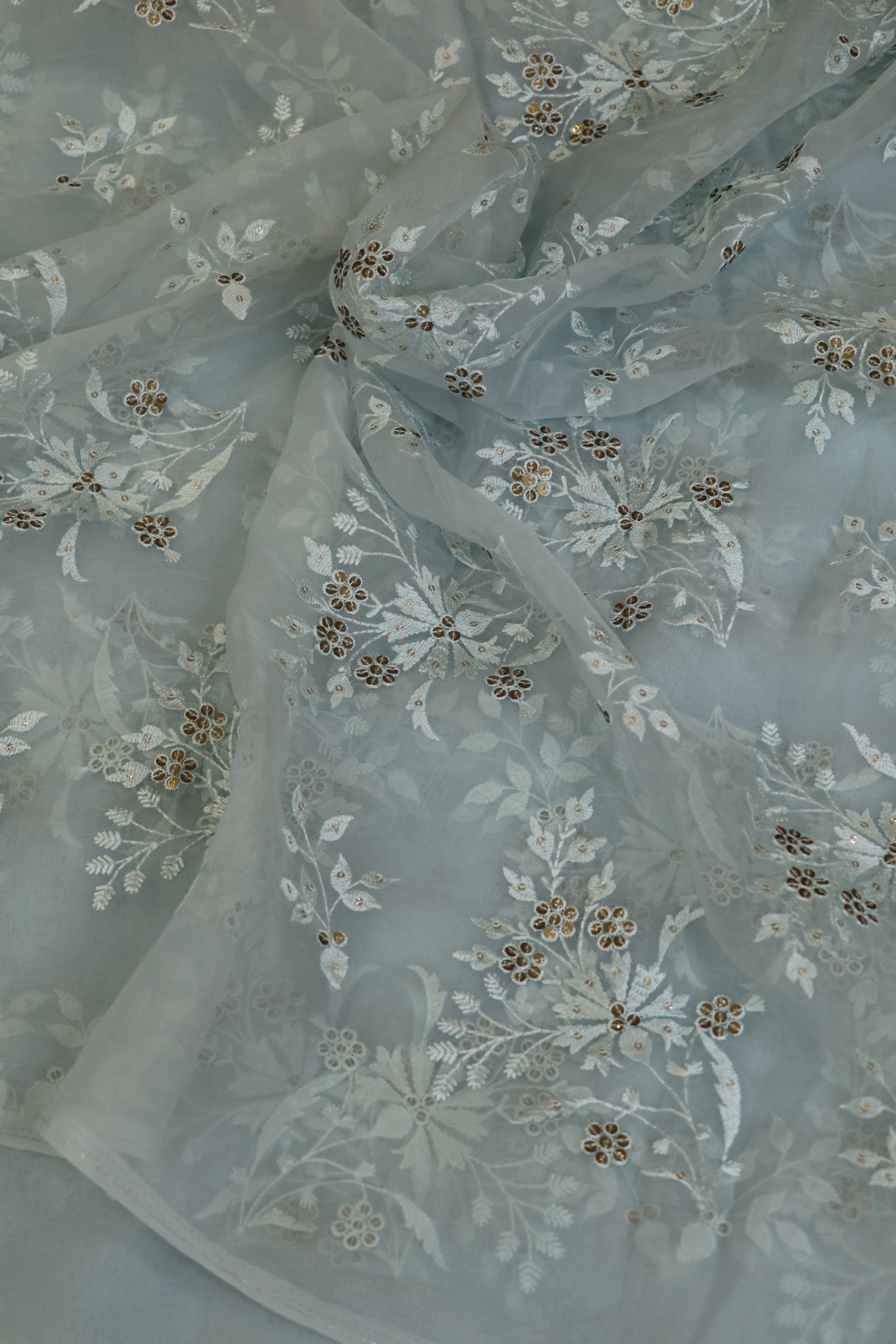 Organza embroidered fabric is a sheer and lightweight textile, enriched with delicate threadwork that adds grace and refinement. Its crisp texture and elegant drape make it ideal for Indian traditional attire such as sarees, blouses,croptops,longfrocks,lehengas and dupattas, while in casual wear it beautifully elevates kurta overlays,anarkalis,overcoat jackets, and festive stoles with subtle sophistication.