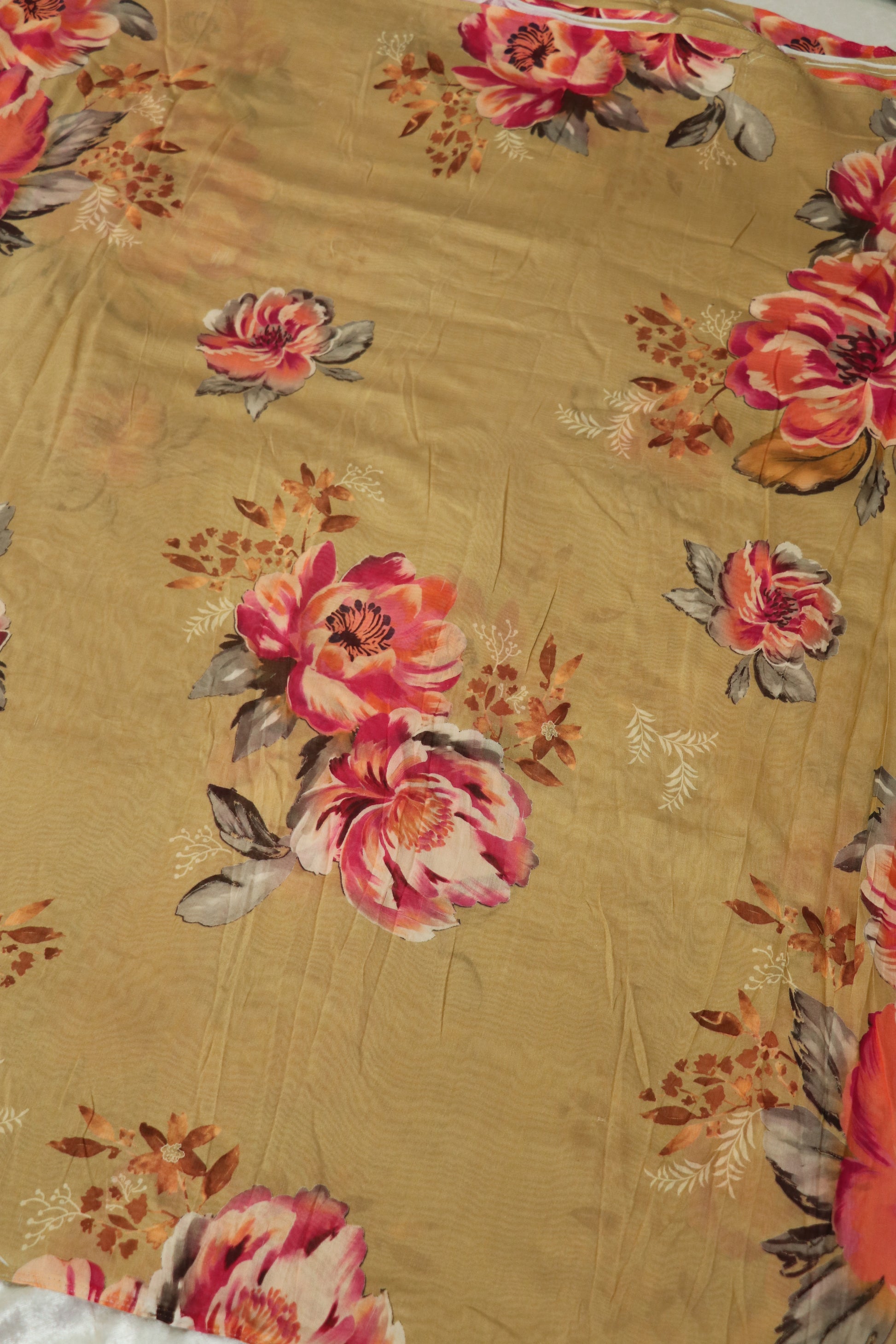 Pastel Board Brown Floral Printed Mul Chanderi Fabric