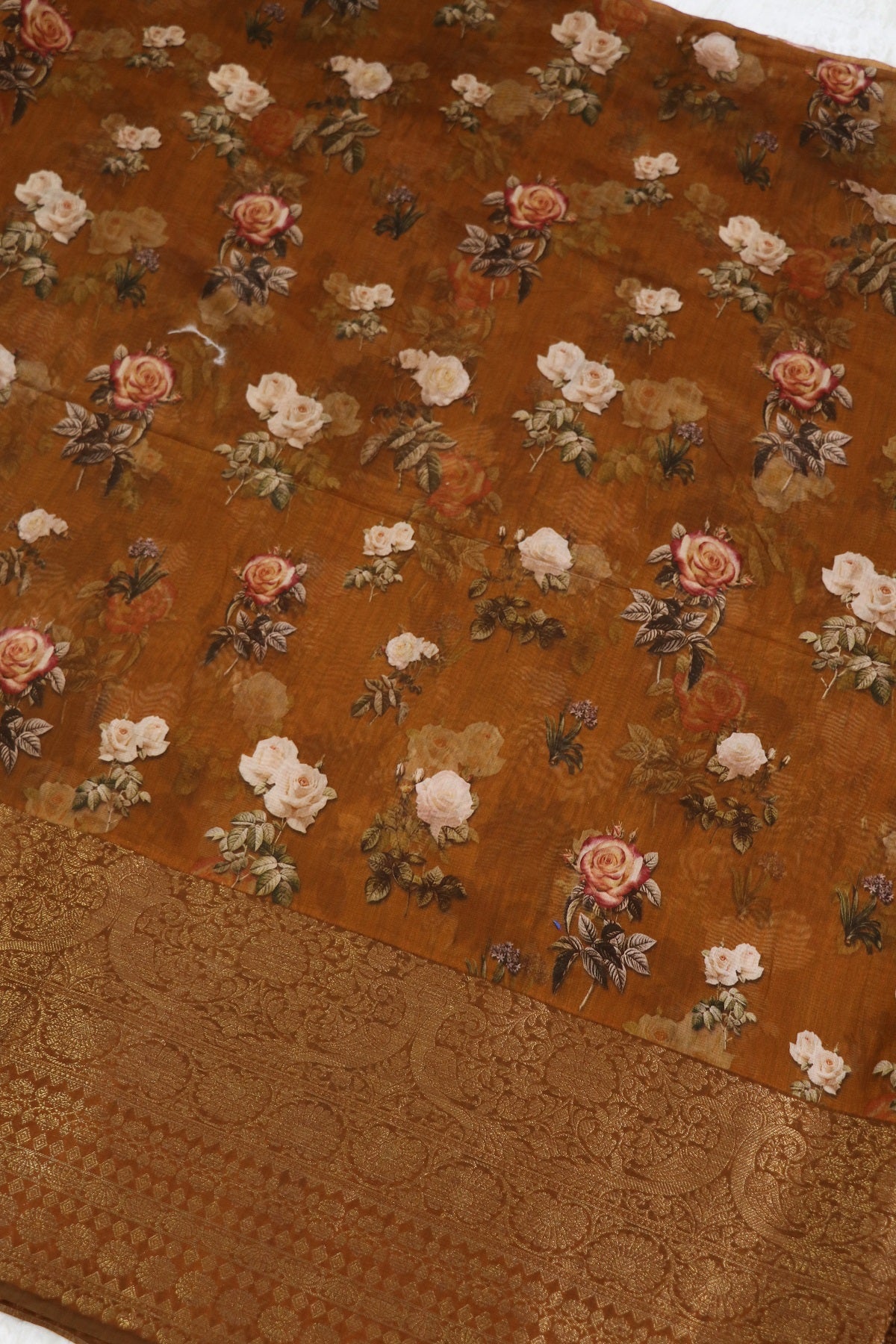 Pure Caramel Brown Chiniya Floral Printed With Antique Zari Woven Lehenga Fabric