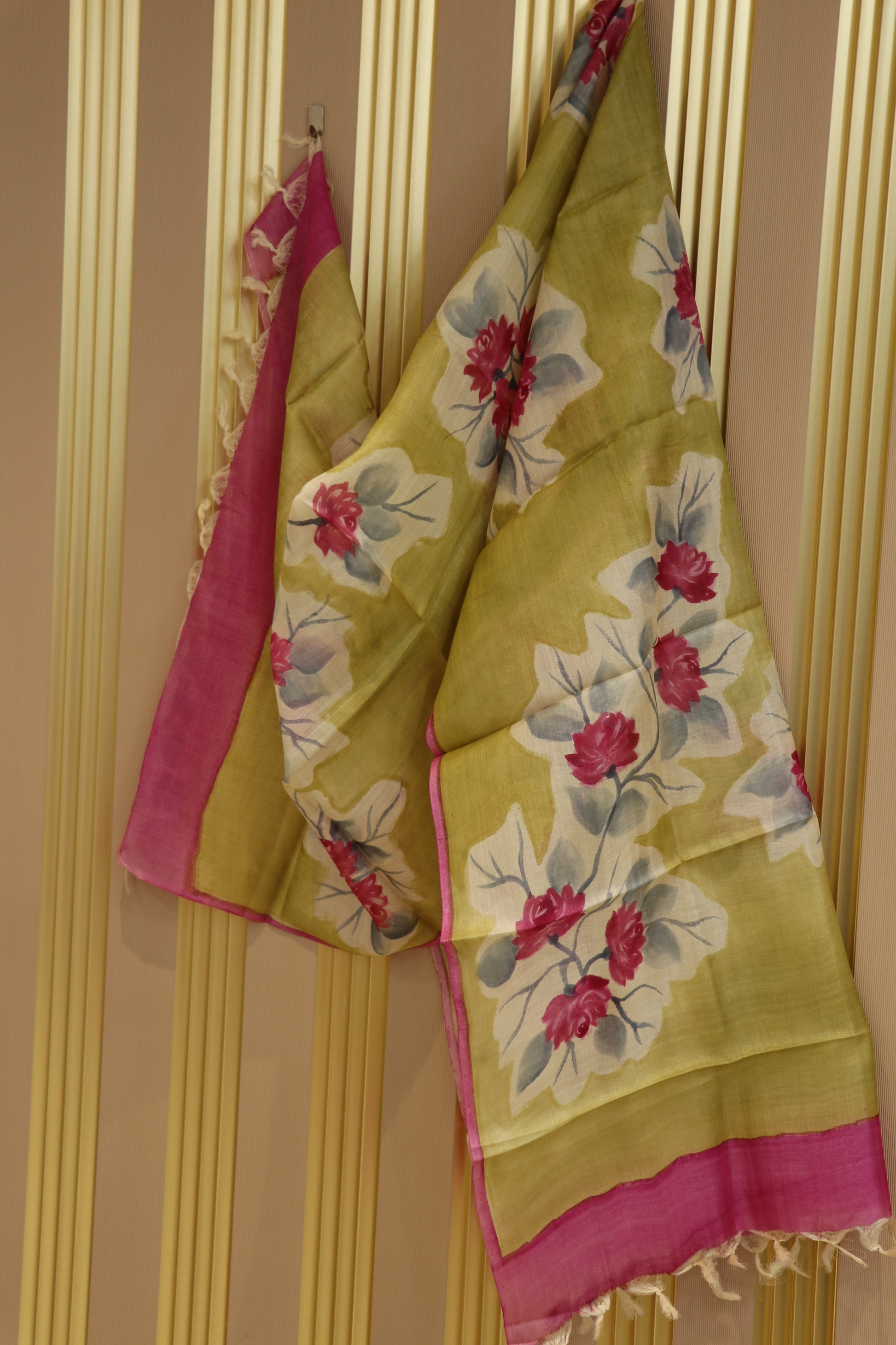 Timeless artistry on authentic tussar silk with natural golden hues hand painted to perfection pair up with ethnic kurtas,formal wear and straight cut tops.