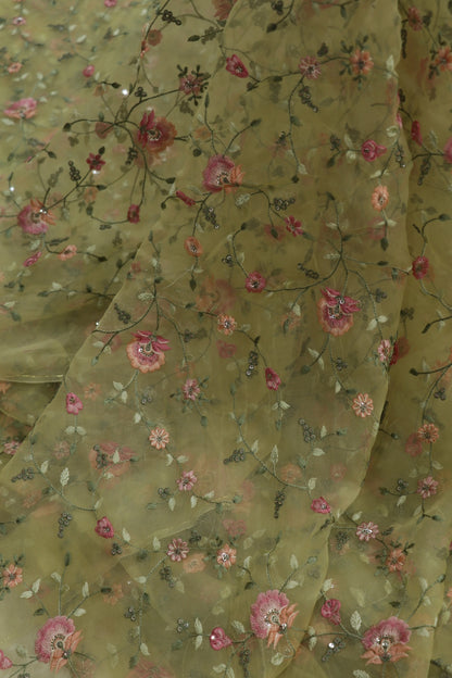 Pure organza with multi-thread work embroidery is a sheer and lightweight fabric known for its crisp texture and elegant translucency. The intricate embroidery adds depth and artistry, making it ideal for Indian traditional outfits like sarees, lehengas, kurtas, and dupattas, while also lending itself beautifully to western silhouettes such as gowns, skirts, overlays, and evening wear.