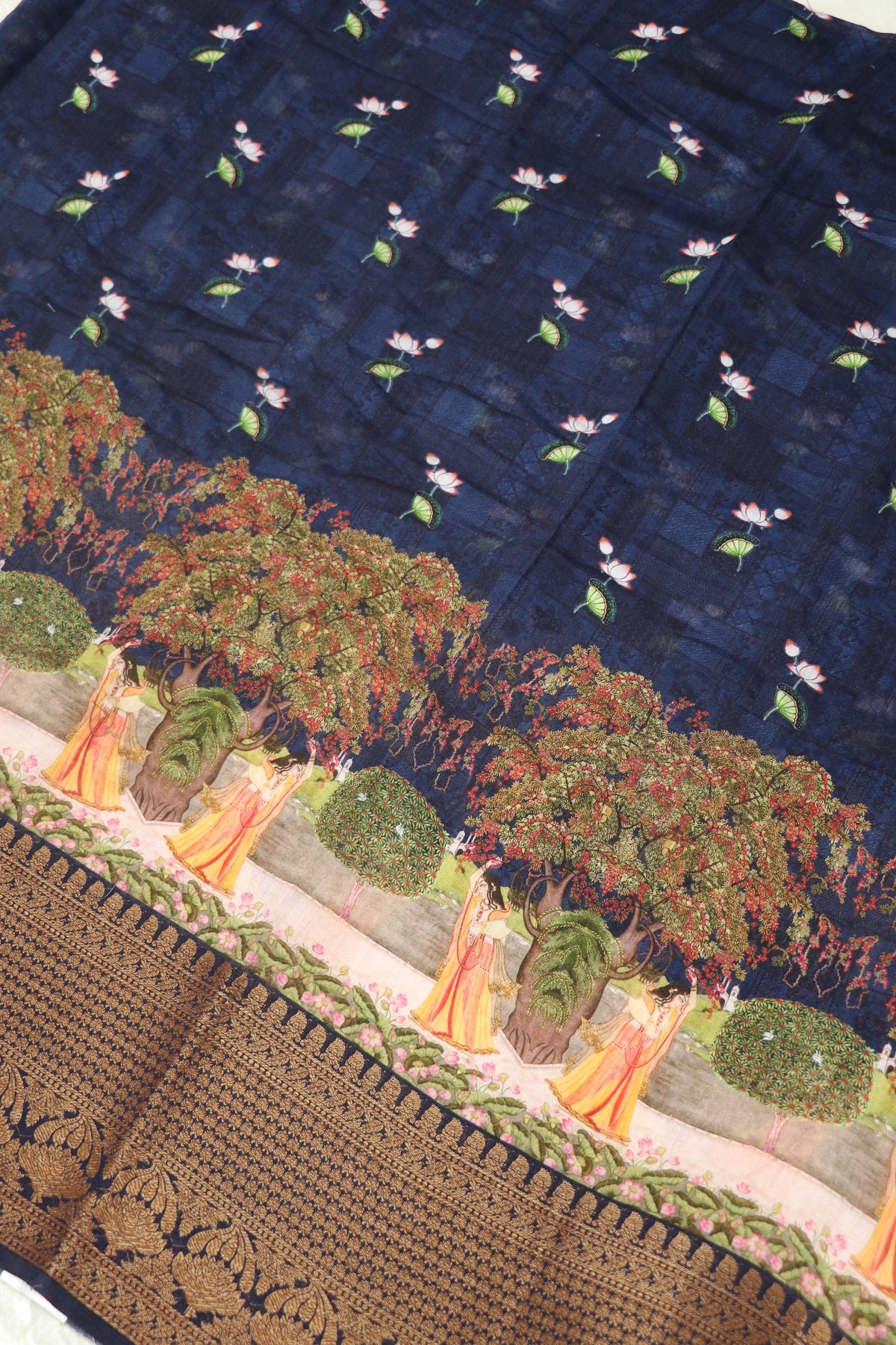 Pure Staple Silk Brindhavan Theme Print With Antiq Kanchi Woven Border