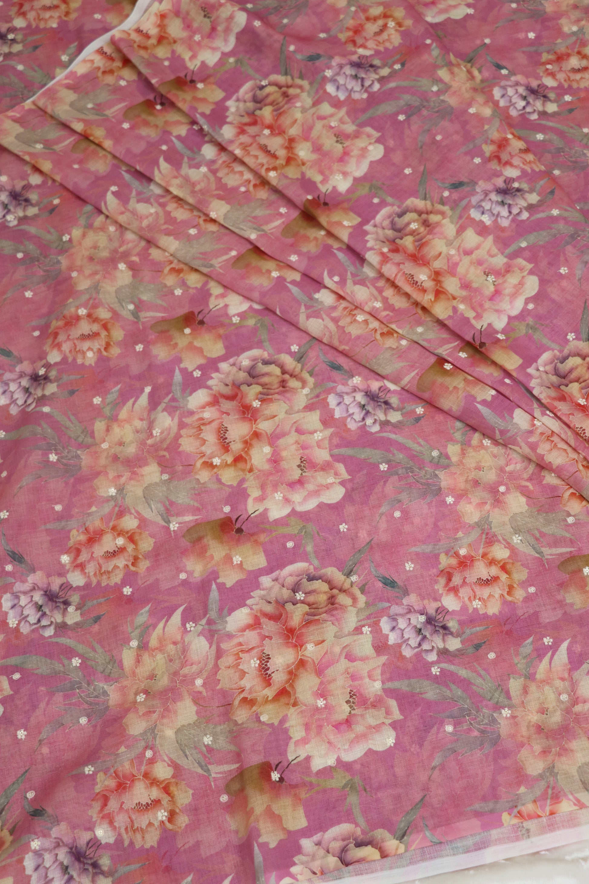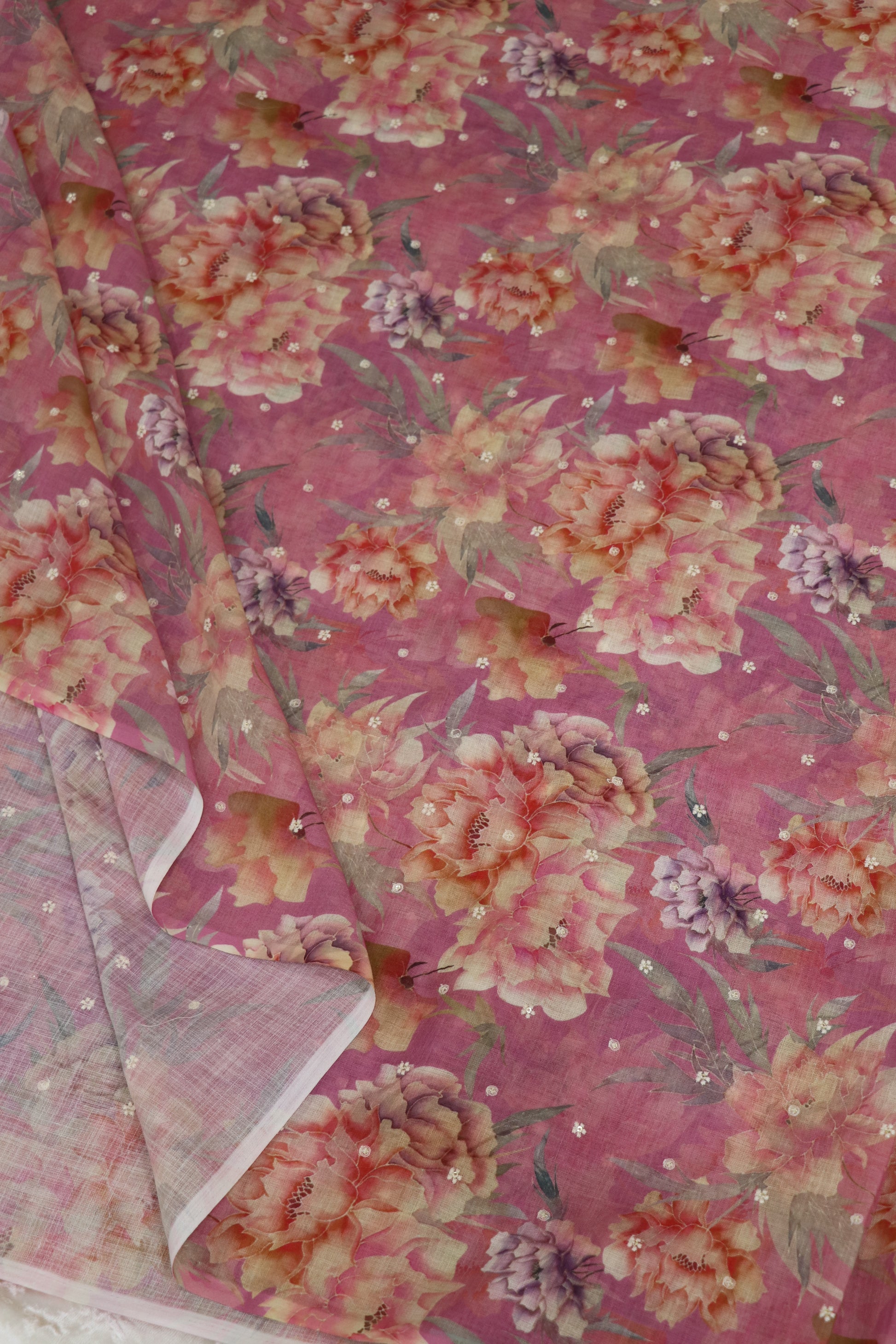 Semi Lenin Floral Printed & Embroidered fabric