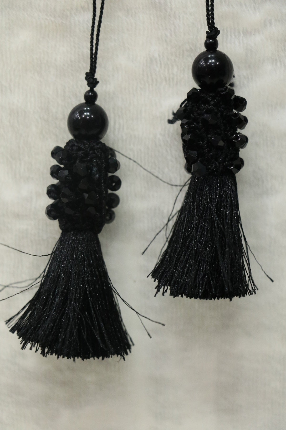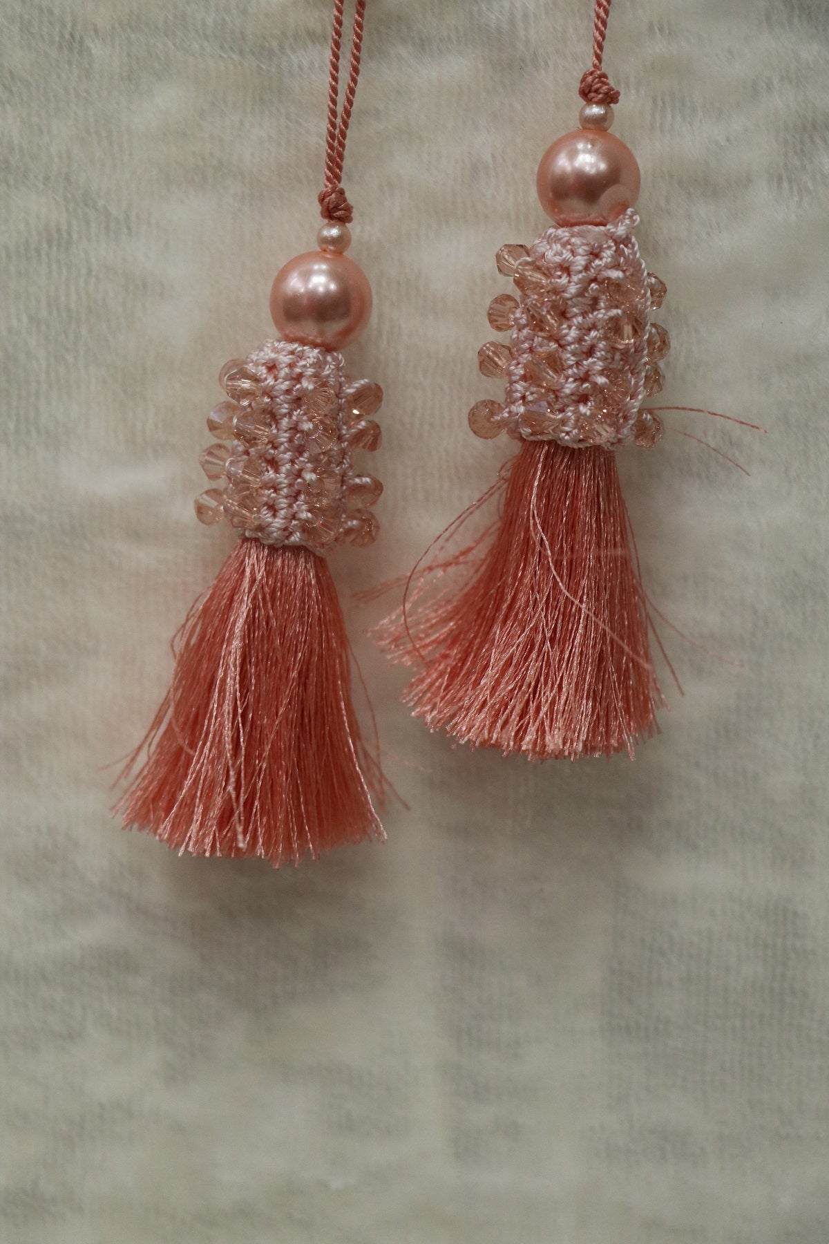 Blouse latkans are decorative tassels or hanging embellishments attached to the tie-ends or back strings of Indian blouses, primarily used for added flair, elegance, and a personalized touch in ethnic wear styling.