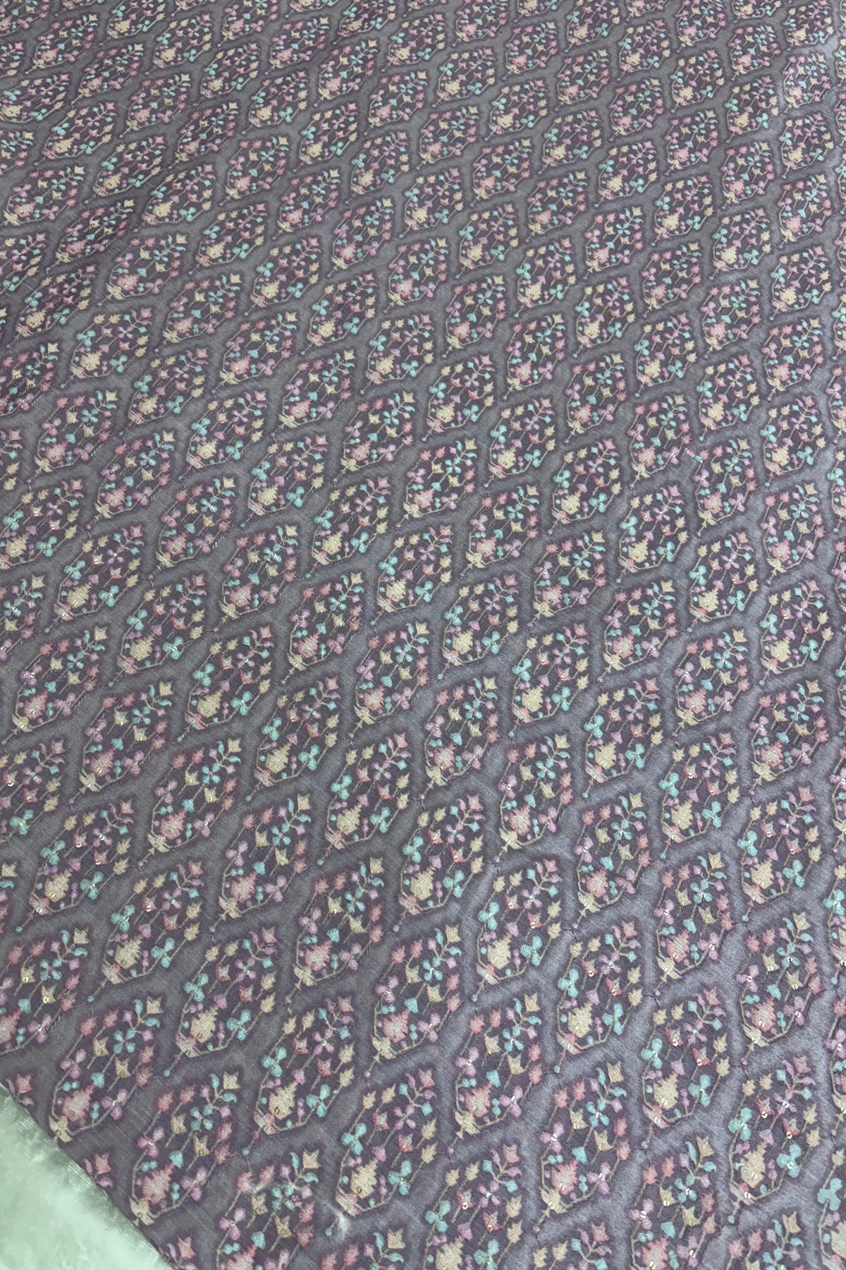 A luxurious raw silk base adorned with delicate multi pastel thread embroidery brings timeless Moghul artistry to life. The intricate motifs exude regal charm, making this fabric ideal for both men’s and women’s traditional wear. Its rich texture and subtle sheen lend sophistication to sherwanis, achkans, jackets, lehengas and saree blouses. Perfect for festive occasions, weddings, and ethnic ensembles that balance heritage with understated elegance.